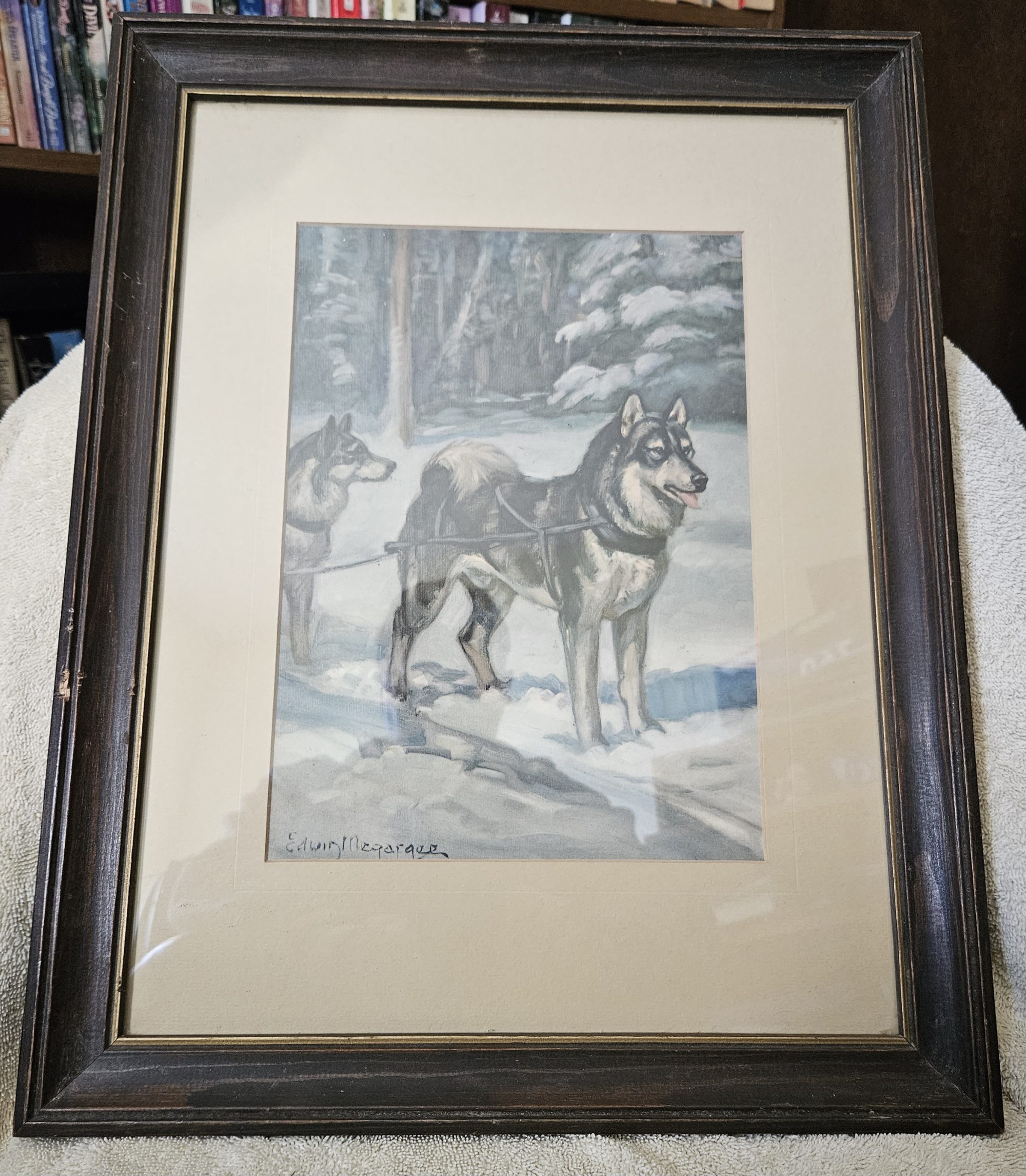 The frame measures 14×18. The image measures 7-1/2×10. This is an excellent illustration of a horse collar type harness used in line.