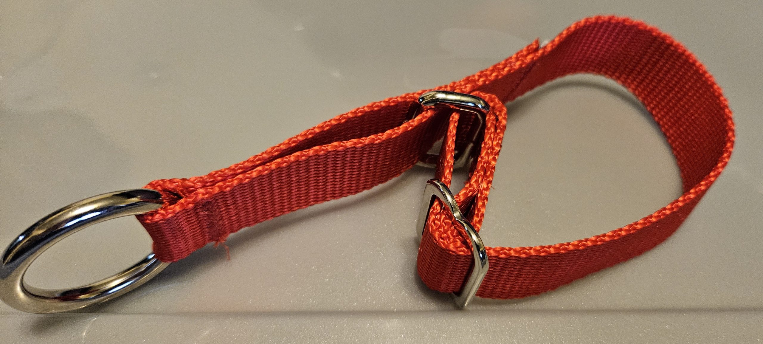 GENERAL COLLAR INFORMATION-Ours are the original adjustable collars designed for working dogs.  They are the tough, humane, reliable, and inexpensive answer to kenneling, chaining, and working your dogs.   The adjustment design uses the full strength of the web—no holes to rip out, no weak hardware or moving parts, no loose ends for puppies to chew.  Once set, the adjustment locks into the web, and stays until reset.  The rings are easy to hang onto, even with gloves.  The hardware is solid, one piece or welded.  These collars are stronger than leather or chain, easy on coats, and skin, more secure than collars requiring buckles, and largely unaffected by extreme weather and hard work.