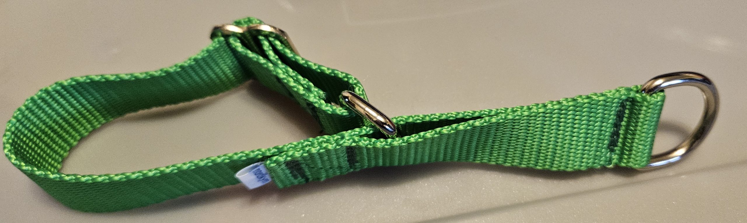 GENERAL COLLAR INFORMATION-Ours are the original adjustable collars designed for working dogs.  They are the tough, humane, reliable, and inexpensive answer to kenneling, chaining, and working your dogs.   The adjustment design uses the full strength of the web—no holes to rip out, no weak hardware or moving parts, no loose ends for puppies to chew.  Once set, the adjustment locks into the web, and stays until reset.  The rings are easy to hang onto, even with gloves.  The hardware is solid, one piece or welded.  These collars are stronger than leather or chain, easy on coats, and skin, more secure than collars requiring buckles, and largely unaffected by extreme weather and hard work.