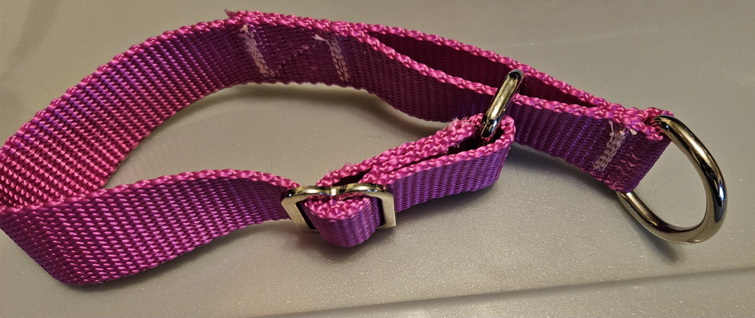 GENERAL COLLAR INFORMATION-Ours are the original adjustable collars designed for working dogs.  They are the tough, humane, reliable, and inexpensive answer to kenneling, chaining, and working your dogs.   The adjustment design uses the full strength of the web—no holes to rip out, no weak hardware or moving parts, no loose ends for puppies to chew.  Once set, the adjustment locks into the web, and stays until reset.  The rings are easy to hang onto, even with gloves.  The hardware is solid, one piece or welded.  These collars are stronger than leather or chain, easy on coats, and skin, more secure than collars requiring buckles, and largely unaffected by extreme weather and hard work.