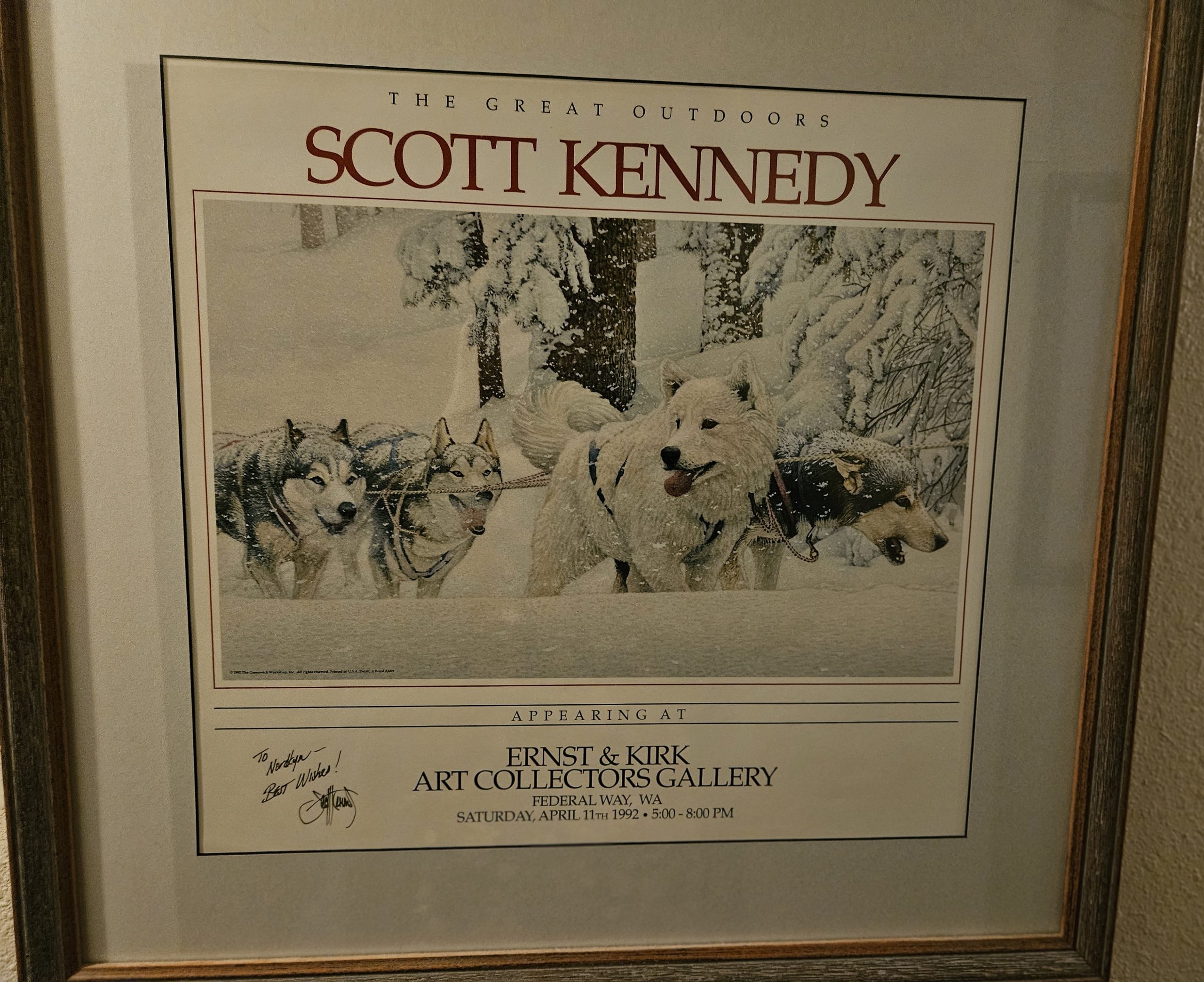 Picture show image of print “A Breed Apart” Image 19″ x18″, matted and framed to 27″ x 26″. This will be shipped by UPS free within the continental U. S. Ignore any shipping that may show in shopping cart. This was part of our personal collection. Scott signed the poster to Nordkyn.