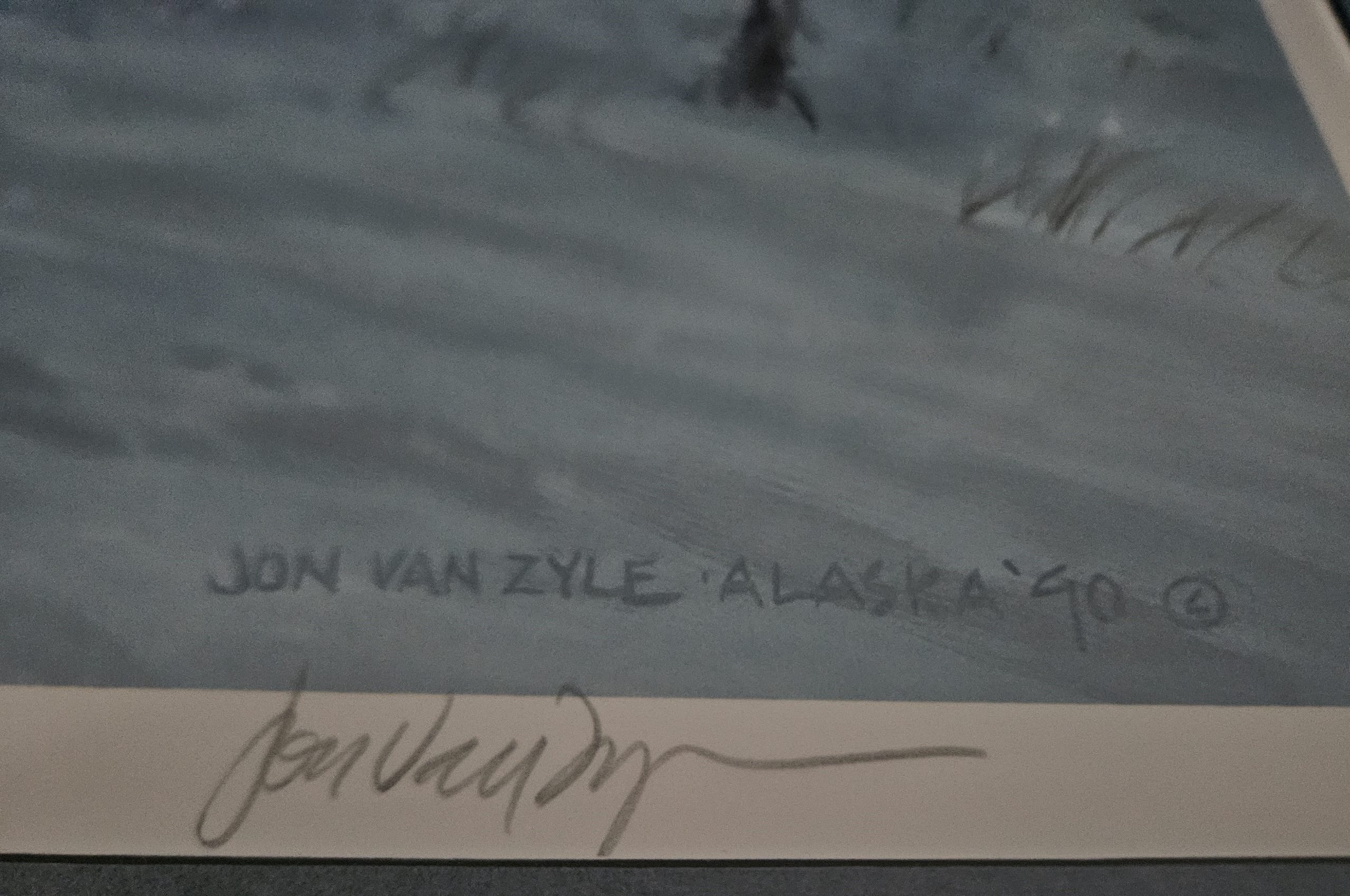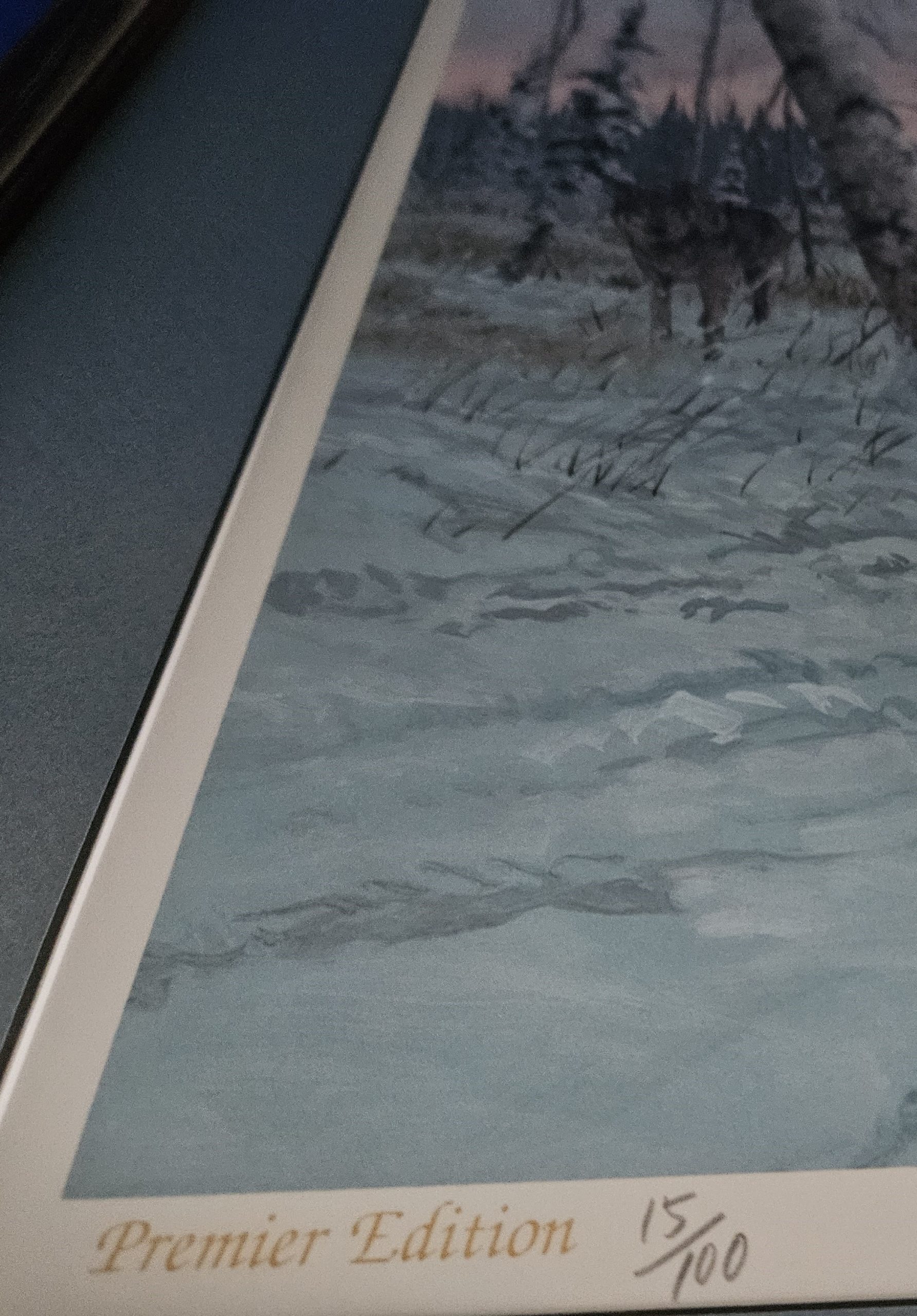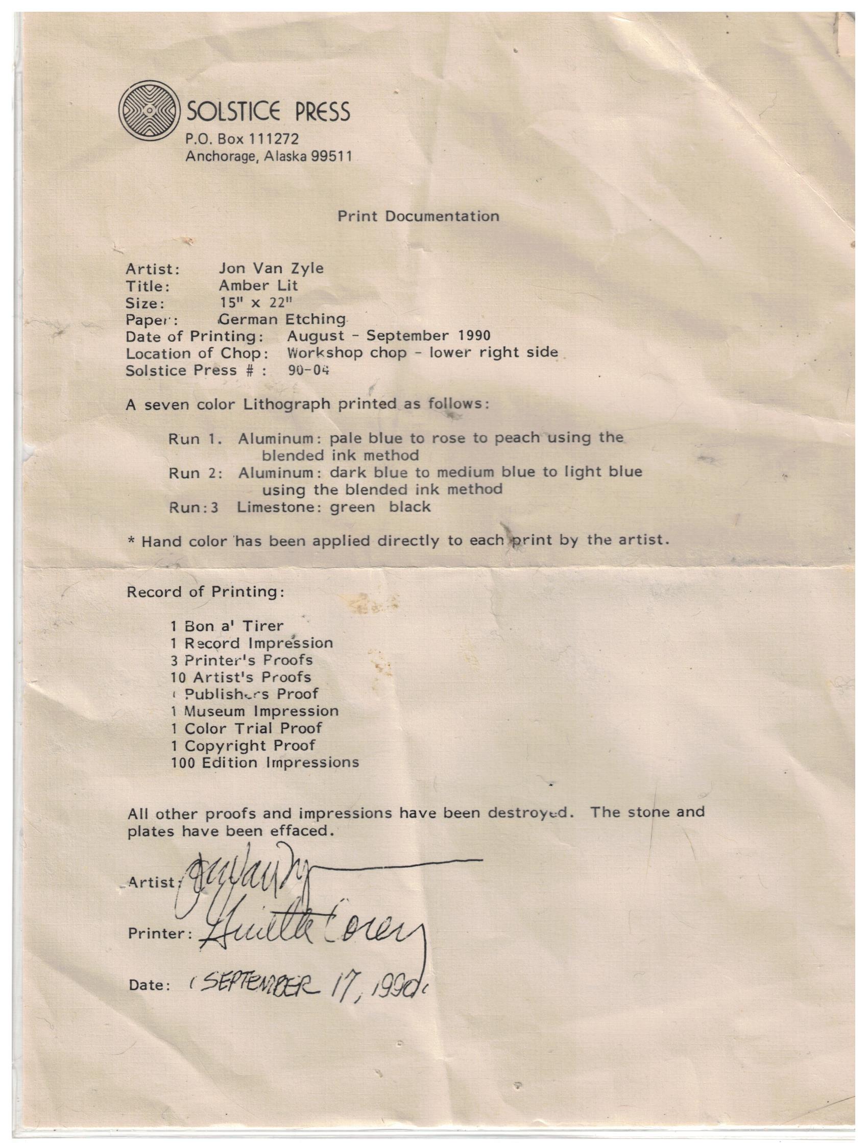 Signed and Numbered Limited Edition  15/100 by Jon Van Zyle.  Wilderness Nexus image size 18″ x 24″, matted, frame size 36″ x 26″.  Amber Lit is a hand colored stone lithograph, image size 9″ x 14″, matted, frame size 19-1/2″ x 26″.  Matching numbers.  Matted and framed professionally.   This was part of our private collection.  Documentation missing.  This will be shipped by UPS.  We will pay shipping but only within the continental U. S.  Ignore any shipping that might come up in shopping cart.