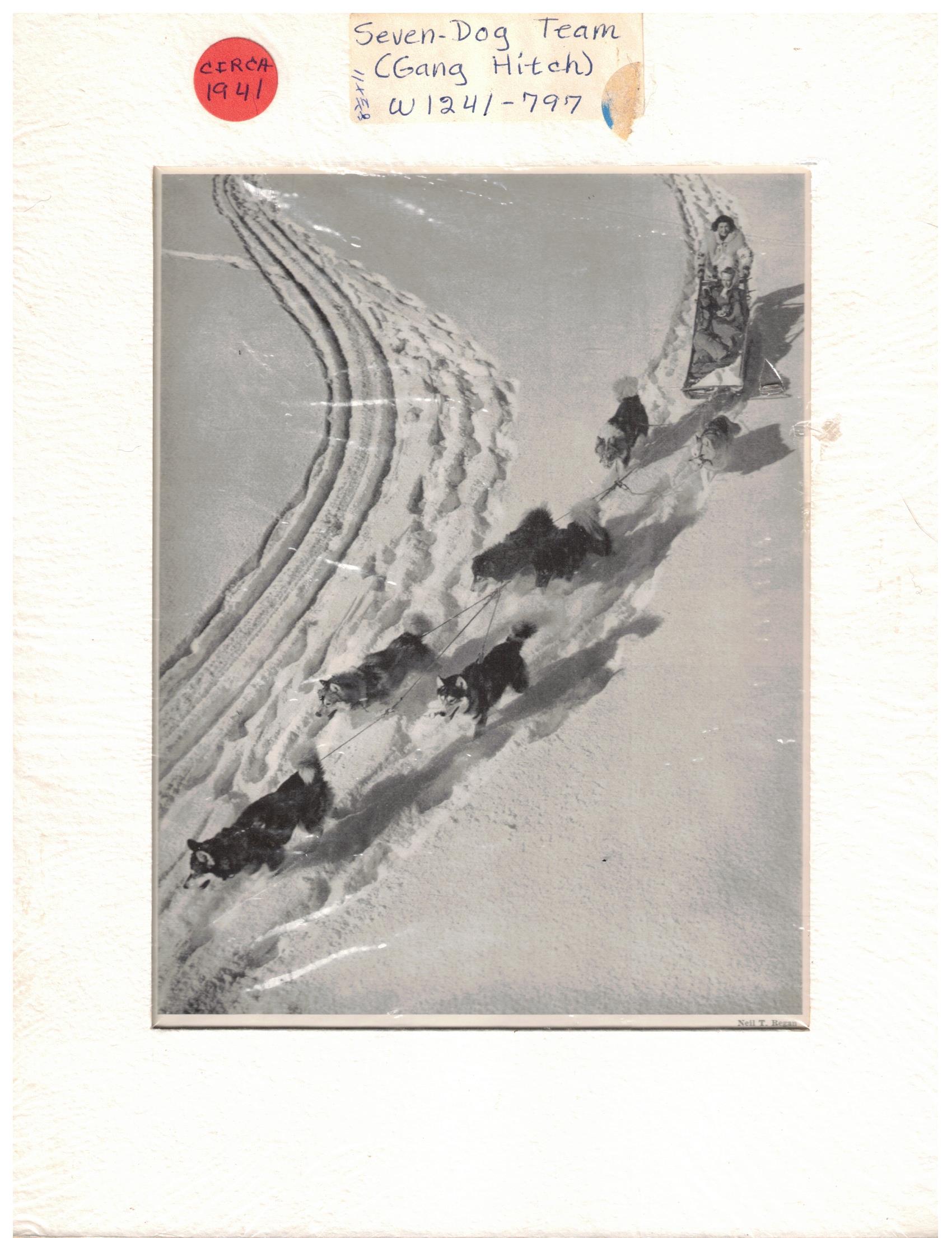 This is an overhead shot of a 7-dog team, taken about 1941. Note the wheel dogs wearing basket muzzles and the freight style sled. Mat 8-1/2″ x 11″, image 5-3/4″ x 7-1/2″. Photographer probably Neil T. Regan